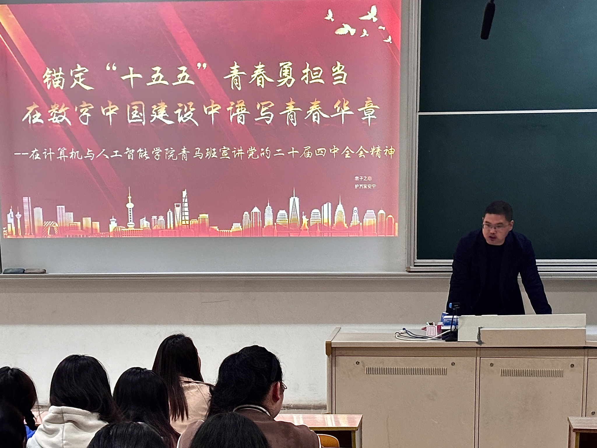 随后,计算机与人工智能学院党委副书记马健以《锚定‘十五五’,青春勇担当》为题,从全会召开背景、主要内容与核心精神、重大意义及学院学子践行路径四方面展开。围绕“十五五”规划与数字中国建设的时代背景,结合计算机与人工智能专业特色,引导青马班学员深刻把握全会精神实质,鼓励他们在数字中国建设浪潮中勇担青春使命,以专业本领践行责任担当,为国家发展贡献青春智慧与力量。刚强有力的语言文字让学员们对党的最新理论成果有了更深刻的理解,也为他们锚定了青春奋斗的方向。