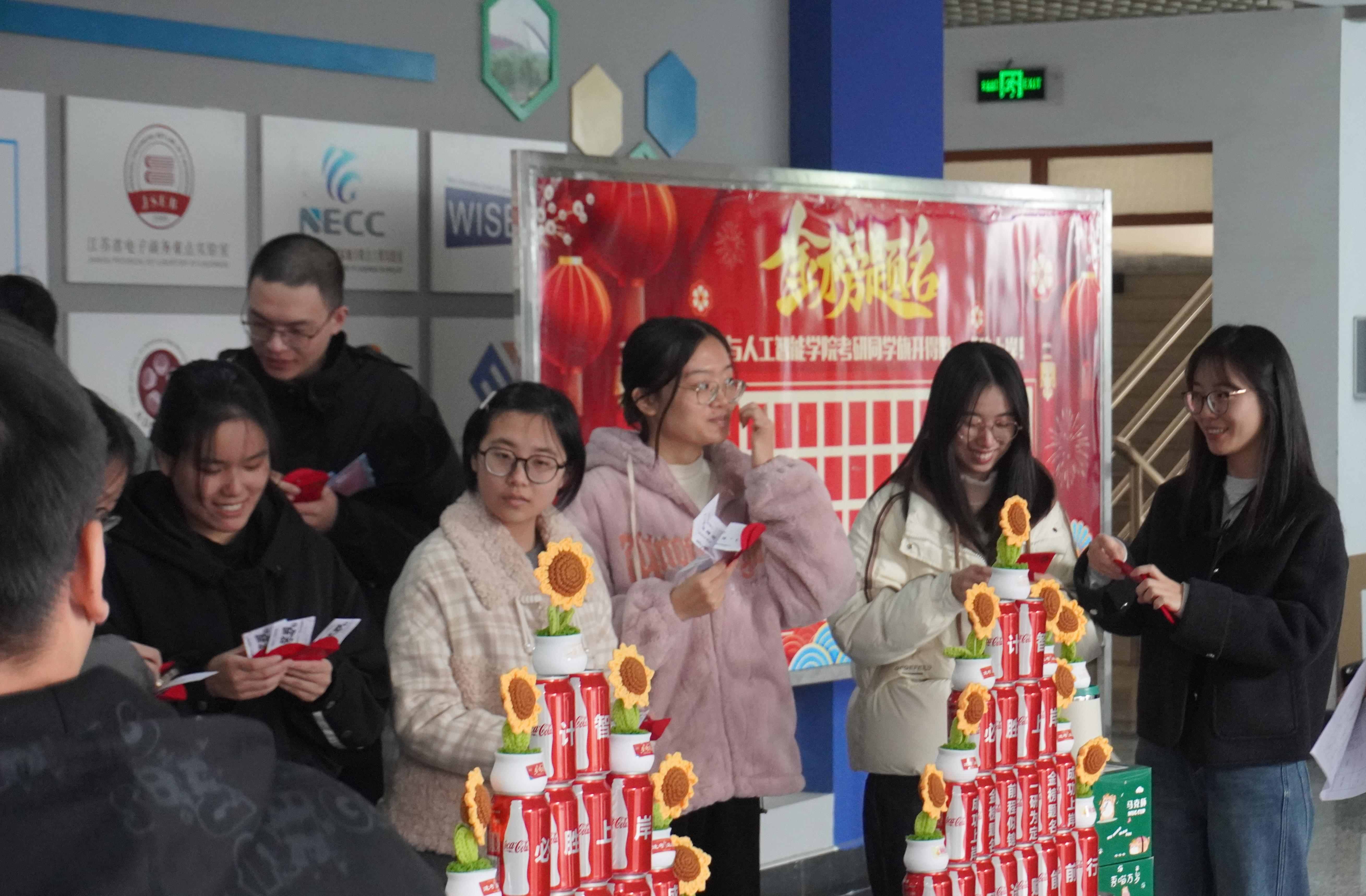 图为考研学子们围绕喜庆的奖品塔兑换祝福