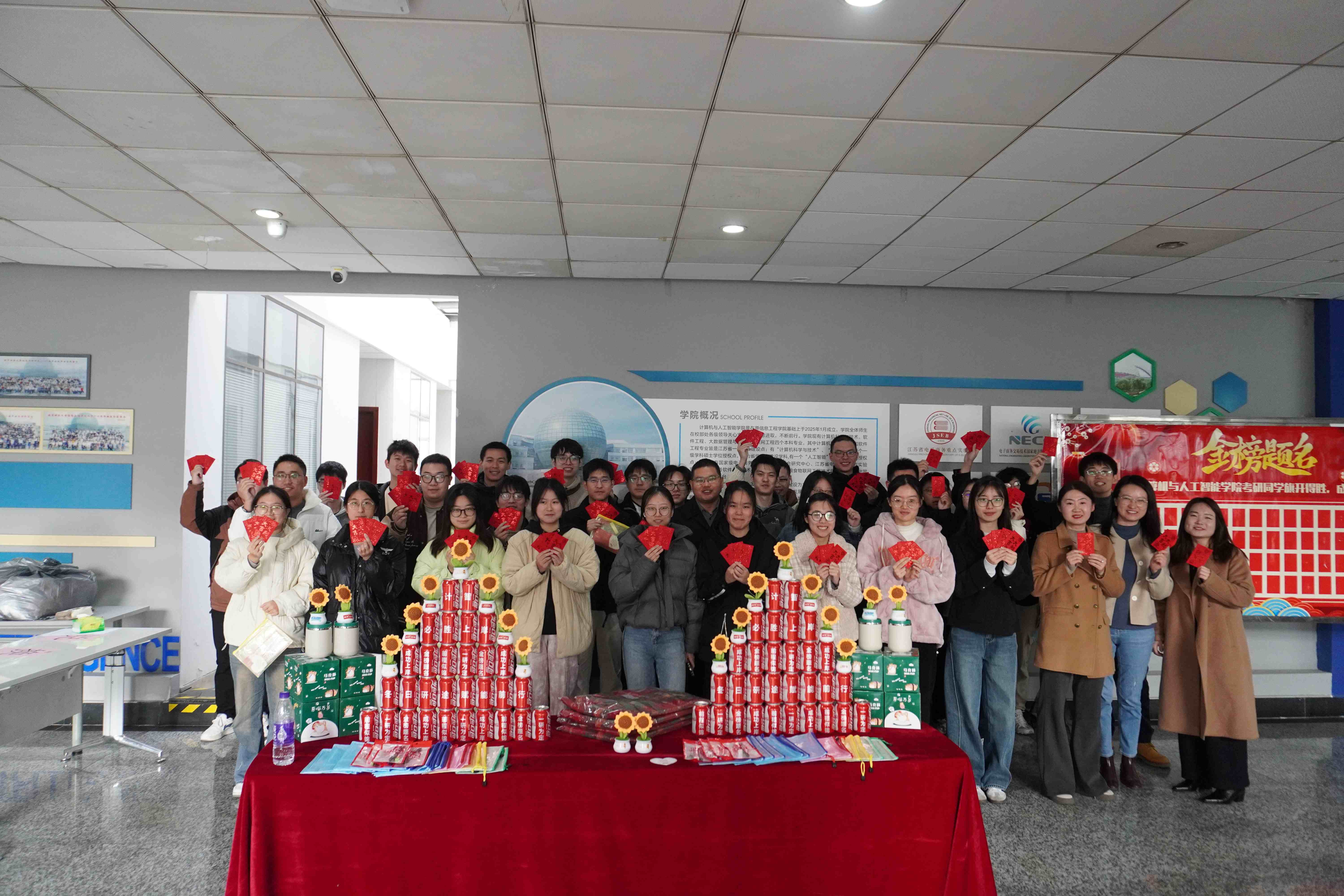 红包墙承载祝福,加油包满载心意,德业楼内暖意融融,为考研学子注入满满正能量。12月10日中午,南京财经大学计算机与人工智能学院在德业楼四楼大厅举行“冬日研途,赋能前行”考研送温暖活动。在考研倒计时10天的关键时刻,学院领导、辅导员以及在读研究生共同为2022级考研学子送上温暖祝福与实用加油包。