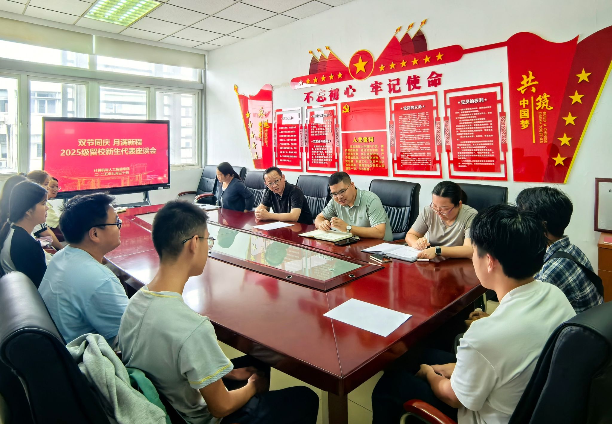 金秋送爽,丹桂飘香。在国庆与中秋双节交汇之际,为缓解留校新生的思乡之情,传递学院关怀,9月30日下午,计算机与人工智能学院举办"双节同庆·月满新程"2025级留校新生代表座谈会。学院党委书记张阳军、党委副书记马健及2025级辅导员与部分留校新生代表围坐一堂,共话团圆,同迎国庆。