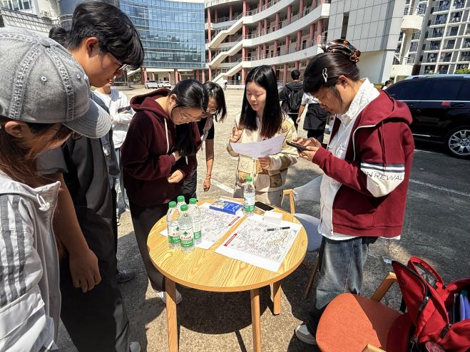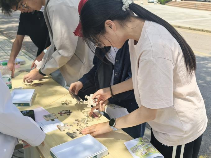 活动涵盖六项主题任务,参赛选手两两组队,依次徒步到达六个任务点并完成相关主题任务。在图书馆处复刻“湘江突围”场景,队员一人戴眼罩、一人以口令指挥穿越障碍,在信任协作中体会红军突破封锁的绝境勇气;西苑食堂的“赤水奇兵”点位,以长征主题拼图为载体,两人合力拼合战役图景,重温“四渡赤水”的战术智慧;北苑超市的“飞夺泸定”点位,队员绑腿同行,踩着胶带模拟的“铁索”前行,再现红军战士勇夺泸定桥的无畏气概;大活门口的“雪山草地”点位,通过网格探路、记忆避“沼泽”的闯关形式,让参与者感受红军过草地时的坚韧意志;艺设楼的“红星照耀”点位,设置长征路线识图与地标问答环节,检验并深化同学们对长征历史的认知;中苑食堂的“新时代长征”点位,以关键词演绎猜词、留言互动的形式,引导学子写下对“新时代长征”的理解与青春承诺。